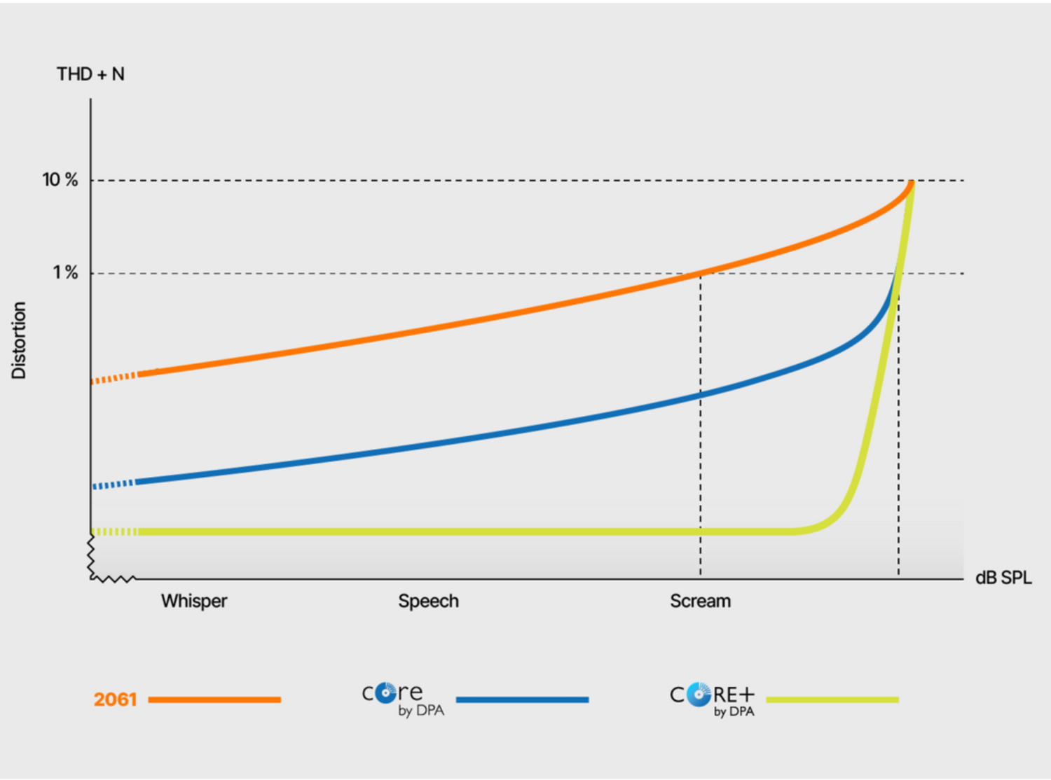 While CORE allows microphones to handle higher SPLs with minimal artifacts up to 1% THD, CORE+ eliminates these artifacts entirely.