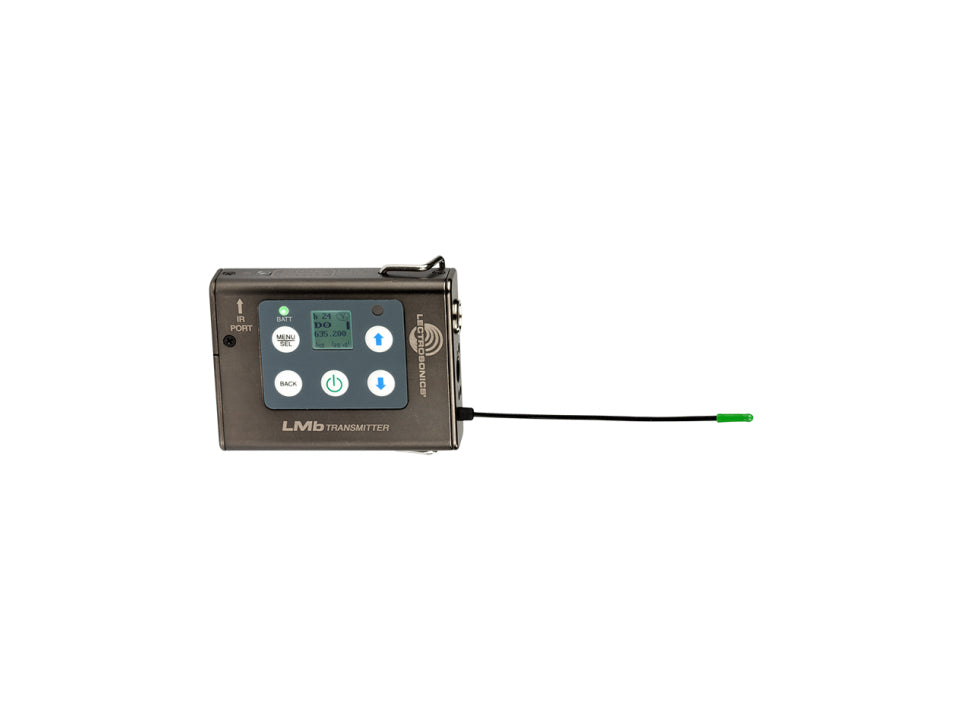 The LMB/E01 features an all-metal housing, wire belt clip, 50 mW of RF power, 25 or 100 kHz tuning steps (yielding up to 3,072 selectable frequencies) and an integrated multi-function switch with menu-selectable modes for power, mute or talkback. A graphic LCD and membrane switch panel plus IR synch port make setup and operation a snap. Power is provided via two AA batteries.