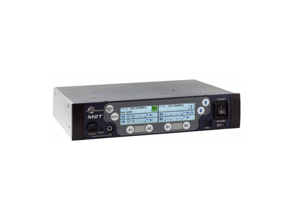 The M2T half-rack transmitter houses two stereo transmitters to provide two stereo audio channels, and for up to four mono audio channels in a single rack space. The audio inputs can be individually configured to be analog or Dante compatible. The analog input connectors are full-size XLR/TRS combo types for balanced line-level analog signals while the input preamp circuits use a special balanced amplifier with very high common mode rejection to minimize hum and noise. A Dante™ Ultimo™ interface via dual RJ45 connectors accepts Dante networked audio inputs and can cascade the digital stream to additional units via CAT6 cables. An additional RJ45 jack provides an Ethernet connection for programming and control via Wireless Designer™ software and a USB jack on the front panel allows for firmware updates. The transmitter features a full color, backlit LCD for high visibility in any environment, while the chassis is all-metal and can be racked singly or in pairs using included rack mount hardware.
