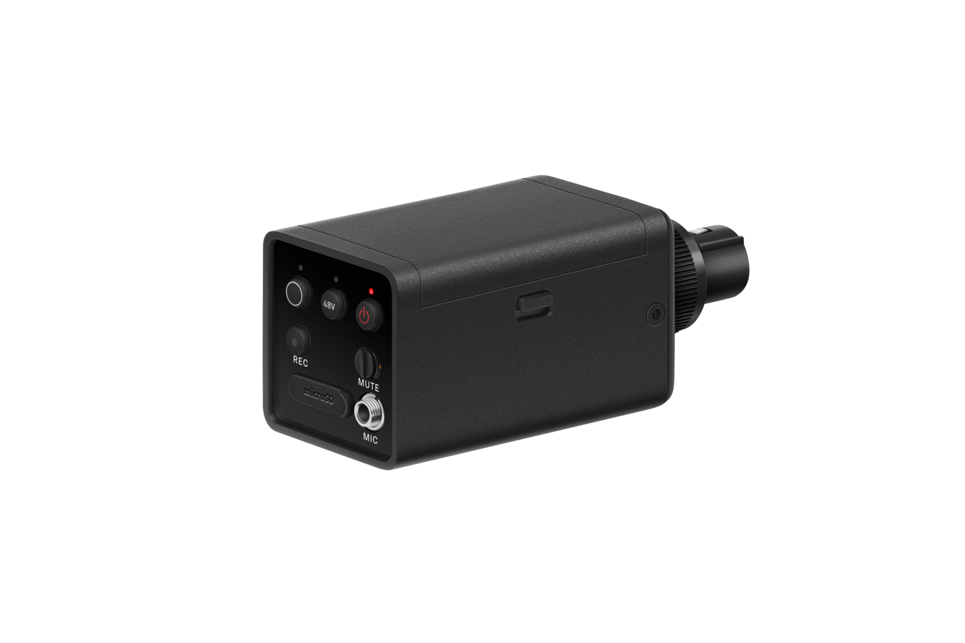 Digital UHF XLR plug-on transmitter with +48V phantom power, microSD card slot for internal recording and 3.5 mm lavalier microphone input, compatible with Evolution Wireless Digital.