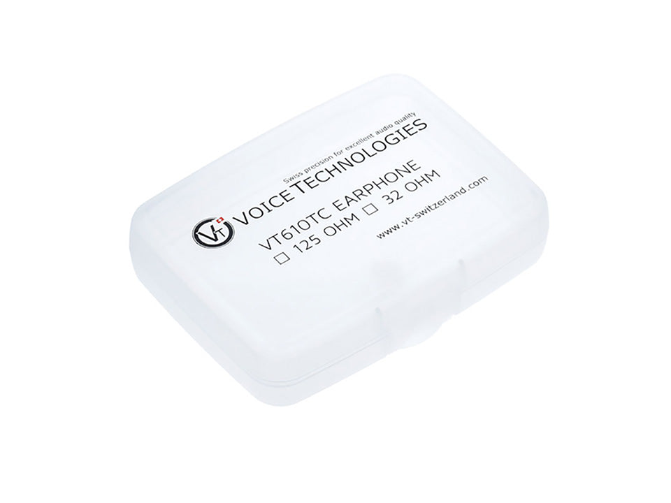 The VT610TC comes in a stable plastic box. As an alternative to the standard earpiece a flexible ear insert for left or right ear (sizes S, M, L, or XL) is also available.