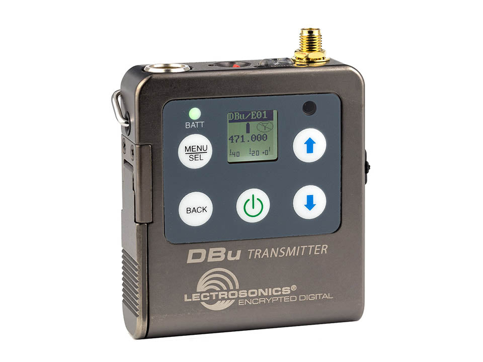 The DBu transmitter is a 4th generation design with specially developed, high-efficiency digital circuitry for extended operating time on two AA batteries. The transmitter can tune in coarse or fine steps across the UHF television band from 470 to 608 MHz (470-614 MHz for export versions), with a selectable output power of 25 or 50 mW. The pure digital architecture enables AES 256-CTR encryption for high-level security applications.