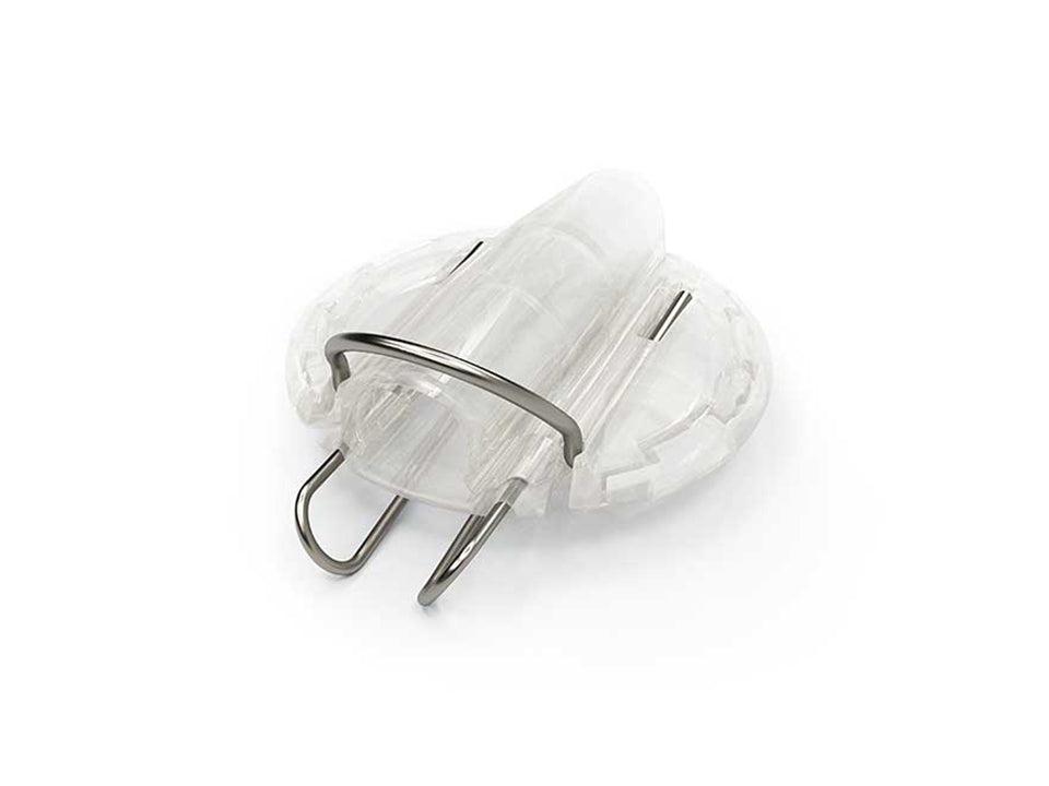 Die Konstruktion ist zweigeteilt; das Oberteil des Concealers kann von der Basis getrennt werden. So kann die Basis an der Kleidung befestigt werden und das Oberteil kann bei Bedarf unabhängig davon entfernt werden. Mit dem Concealer wird eine einzigartige, abnehmbare Distanzklammer geliefert, die einen sicheren Abstand zur Kleidung gewährt. Dies verhindert, dass Kleidung den Concealer berührt und dadurch Geräusche verursacht werden. Die Distanzklammer kann am oberen Ende des Concealers eingeclippt werden.