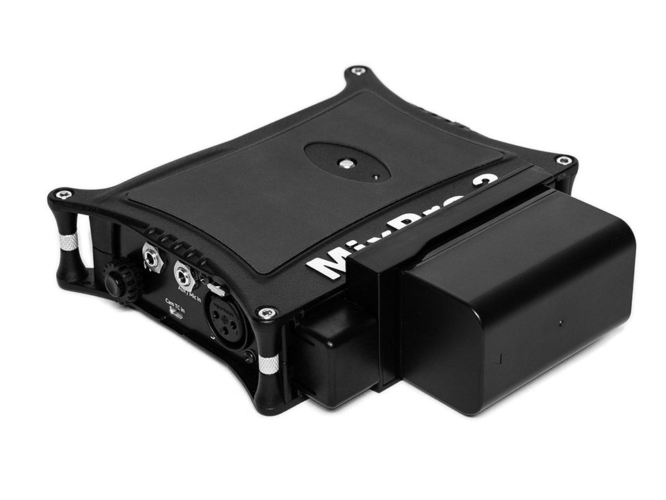 L-Mount Akku-Schlitten. Nimmt einen L-Mount-Akku auf (nicht im Lieferumfang enthalten). Versorgt die Recorder der MixPre Original-Serie, der MixPre-M-Serie und der MixPre II-Serie.