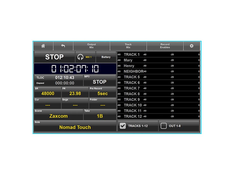Die Nomad Touch-Software macht den Zugriff auf die Leistung eures Nomad unglaublich einfach. Sie bietet einfachen Zugriff auf Menüs und Matrizen, Kreuzungspunkte und Metadateneingabe, erweiterte Metering-Ansichten, eine viel größere visuelle Timecode-Tafel mit Metadaten, einen vollwertigen Playback-Controller für die gleichzeitige Audiowiedergabe während der Aufnahme und die MovieSlate® Wi-Fi-Schnittstelle für den direkten Austausch von Metadaten.