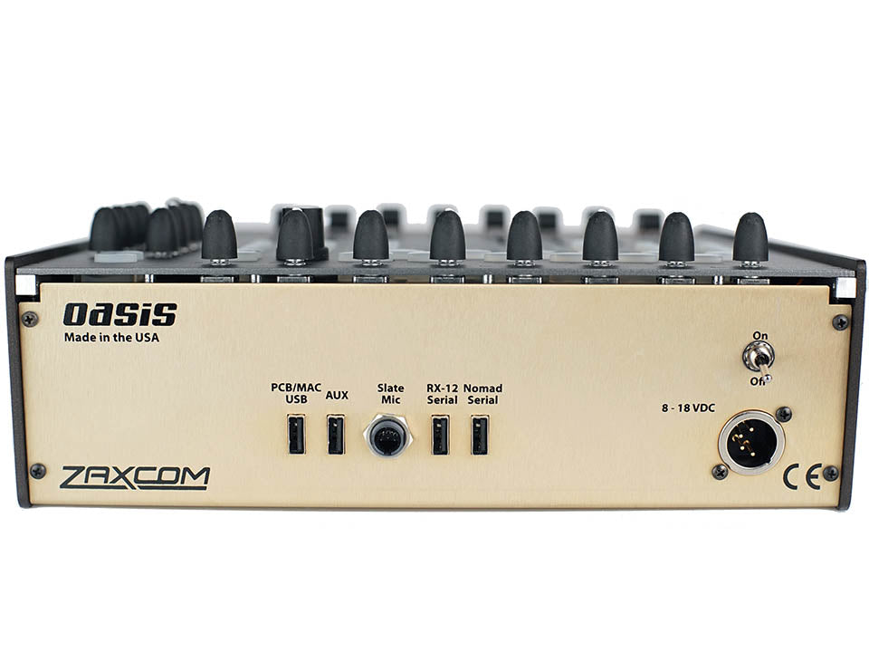 Das Oasis-Mischpult wird mit nur einem Kabel an den Nomad angeschlossen. So kann in Sekundenschnelle von Tonwagen auf Tasche gewechselt werden. Der voll ausgestattete Controller verfügt über 8 berührungsempfindliche Motorfader auf 3 Bänken für die bis zu 40 wählbaren Kanäle. Darüber hinaus ist jeder Kanalzug mit Trimregler /Zaxnet-Gaincontrol, LED-Meter und PFL-Knopf ausgestattet. Weitere Funktionsknöpfe für Metadaten, Routing, Kanalzugrilff, sowie 8 dedizierte Ausgangsregler, Transportkontrolle und Talkback-Sektion machen den Oasis zu einer echten Allzweckwaffe mit dem Nomad 12. Das große Userinterface auf dem Touchscreen übernimmt jegliche digitale Kontrolle über die Rekorderfunktion und bildet so mit dem Hardware-Controller eines der intuitivsten und komplettesten Aufnahmesysteme für den Filmtonbereich.