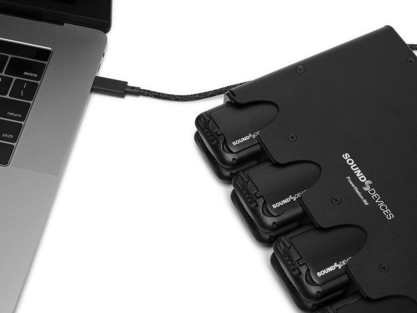 Die PowerStation-8M ermöglicht einfaches Aufladen der Akkus, Dateiübertragung und Timecode-Jamming von bis zu 8 A20-Minis gleichzeitig. Stromversorgung über DC (TA4) oder USB-C (USB-PD).